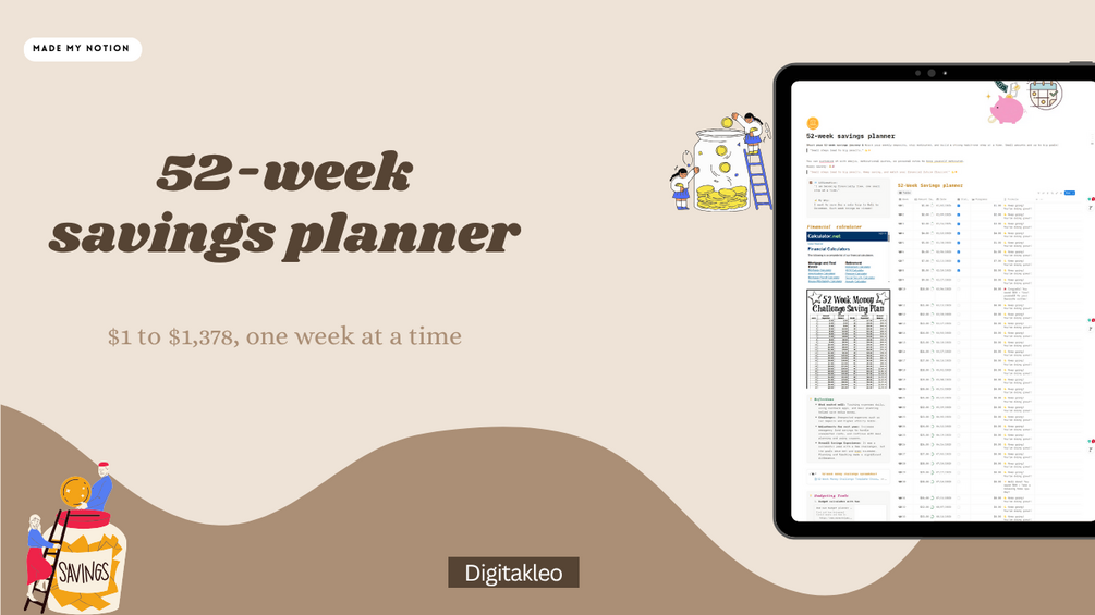 Take control of your finances with this interactive and customizable 52-Week Savings Planner. Perfect for beginners or seasoned budgeters, this Notion template helps you track weekly deposits, monitor your progress, and reach your savings goals without stress. Whether you're saving for travel, debt repayment, or an emergency fund, this planner guides you step by step—one small deposit at a time.