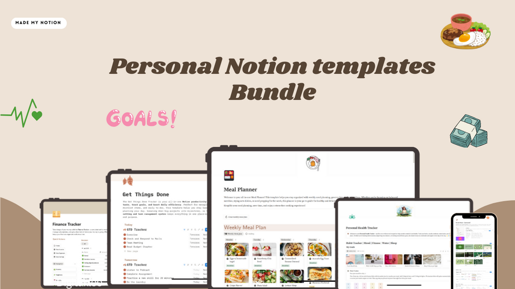 Simplify your life with the Personal Notion Templates Bundle by Momomuse Studio. Whether you’re managing your money, tracking goals, planning meals, or organizing your home — this bundle gives you 6 powerful tools in one to stay productive, balanced, and stress-free.