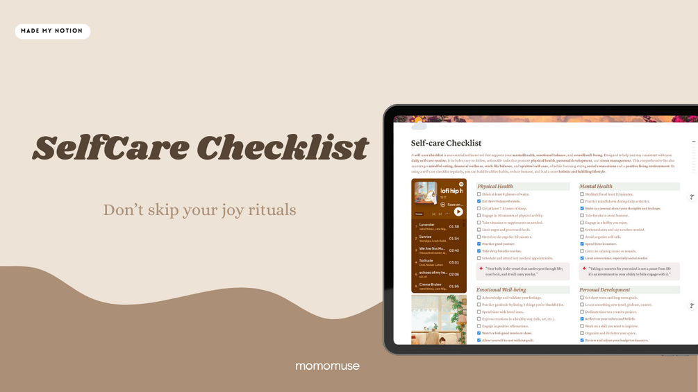 This all-in-one Self-Care Checklist Notion Template helps you stay consistent with your emotional, mental, and physical well-being—without the overwhelm. Thoughtfully structured across 12 dimensions of self-care (from spiritual growth to financial wellness), it empowers you to track, reflect, and develop intentional daily habits that truly nourish every area of your life.