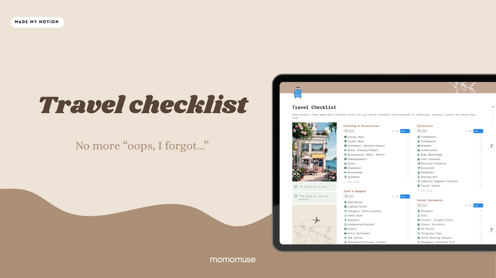 Say goodbye to the pre-trip packing panic! This all-in-one Notion Travel Checklist Template helps you stay fully prepared, no matter where you’re headed. With over 12 categorized sections and a clean layout, it ensures you never forget an essential item again—whether it’s your passport, sunscreen, or your pet’s travel food.