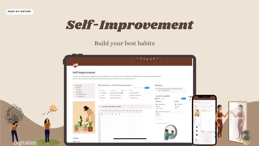 With guided sections for journaling, affirmations, skill development, fitness, and vision planning, this template helps you grow consistently while staying motivated and mindful of your journey.