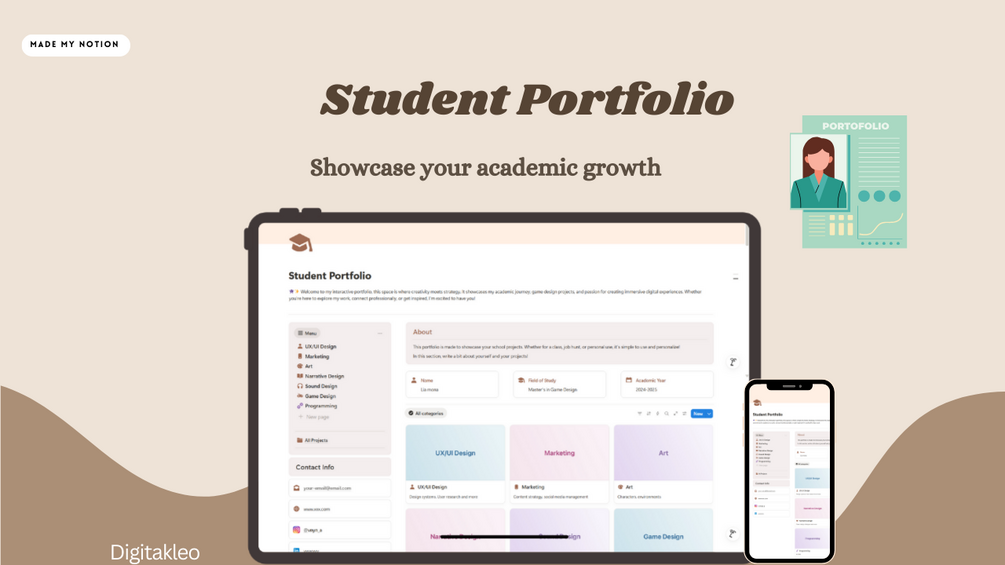 The Student Portfolio is a clean, customizable Notion template designed to help students professionally present their academic journey, projects, and creative work. Perfect for job applications, school presentations, or personal growth, this portfolio blends functionality with style to help you stand out.